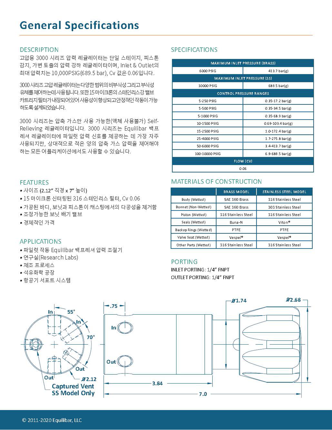 Inlet & Outlet의 최대 압력치는 10,000PSIG(689.5 bar), Cv 값은 0.06입니다.