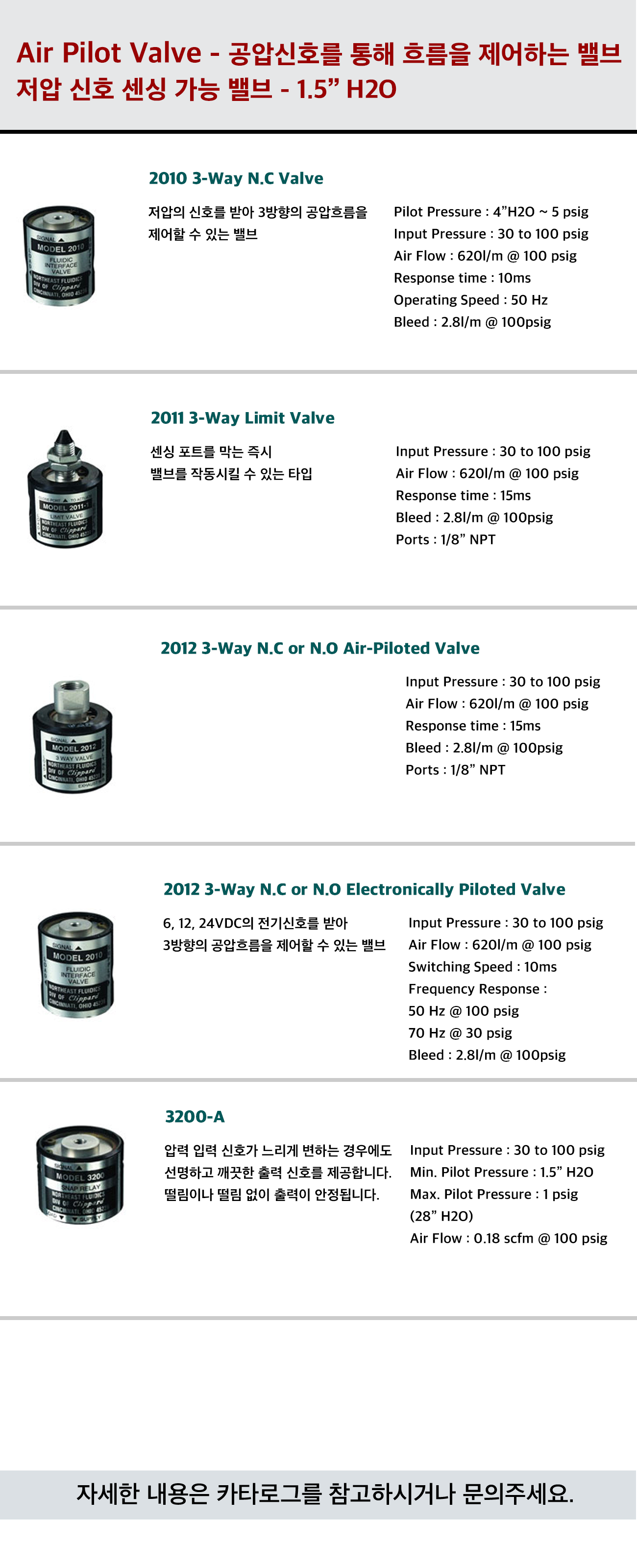 "저압(low pressure)"이라는 용어는 상대적인 개념입니다. 이 시리즈의 밸브는 최소 1.5인치 H₂O의 압력까지 감지할 수 있으며, 이를 통해 증폭 밸브를 작동시켜 최대 150 psi의 출력 압력과 25 scfm 이상의 유량을 제공하여 대부분의 고유량 소형 공압 어플리케이션을 커버할 수 있습니다.