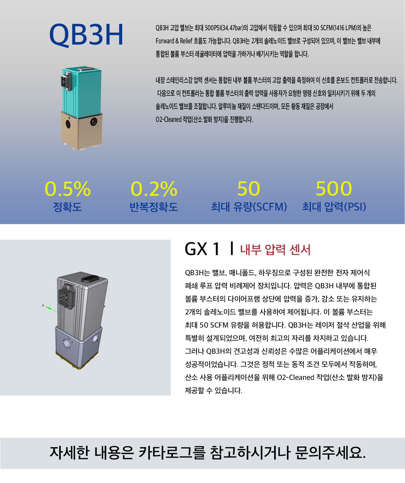 정확도 : 0.5% 반복 정확도 : 0.2% 최대 유량 : 50 SCFM 최대 압력 : 500 PSI