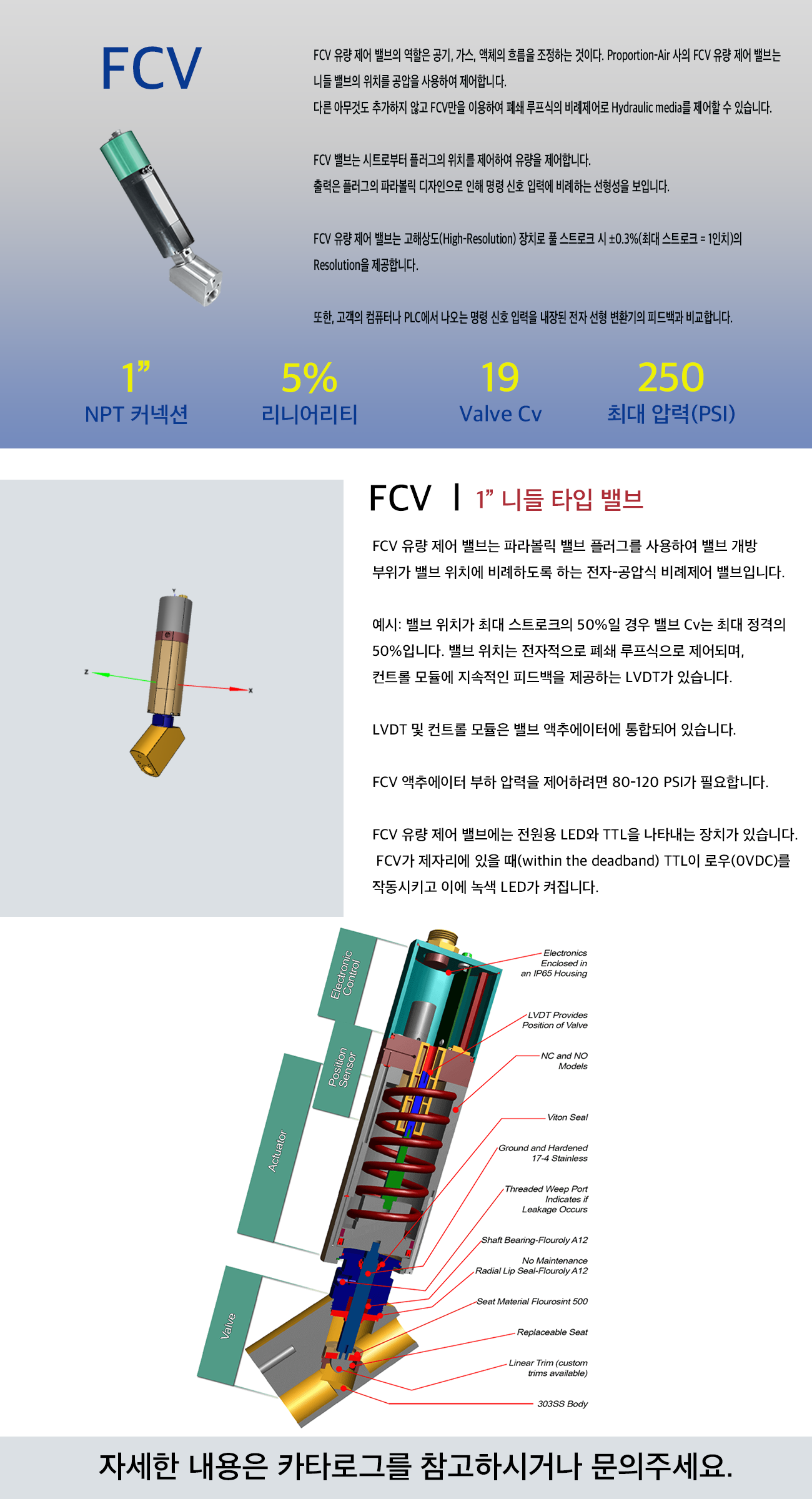 니들 밸브 타입으로 유량을 조절하며, 밸브 하나만으로 비례제어가 가능합니다.