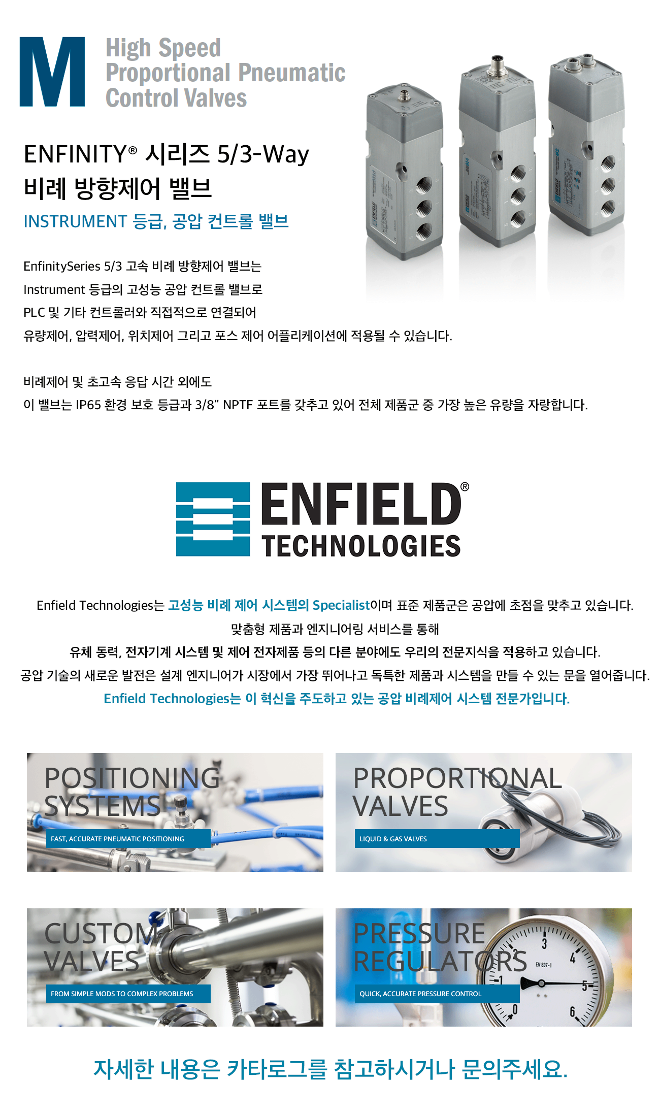 비례제어 및 초고속 반응속도 이외에도 IP65 등급 방수 및 방진 기능을 갖추고 있으며 Enfield사 제품 중 가장 큰 유량을 제어합니다.