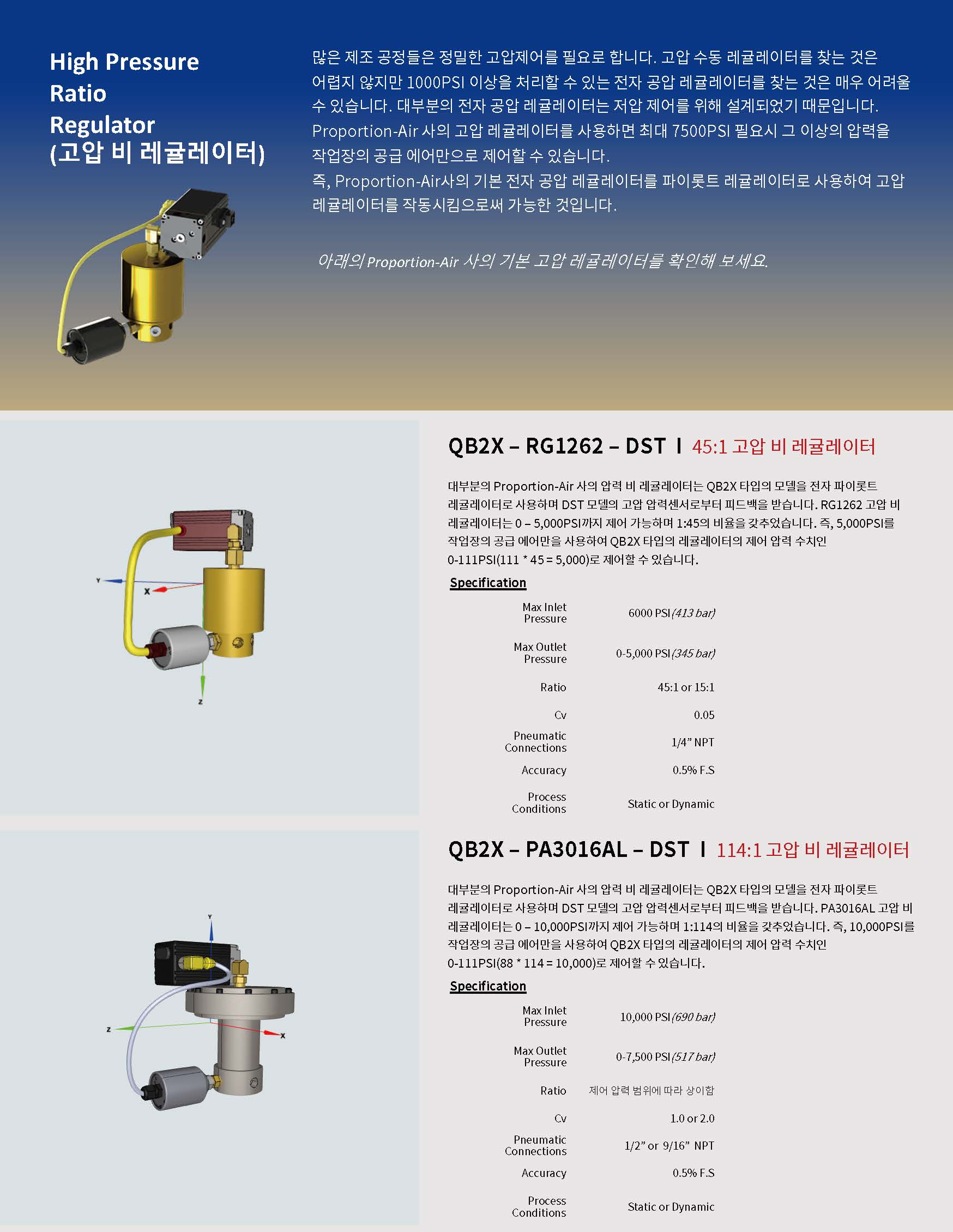 미국 Proportion-Air 사의 Closed-Loop 특허 기술을 사용한 전자 공압 비례제어 밸브입니다. 전자 공압 비례제어 밸브 & 파이롯 레귤레이터 & 압력 센서의 조합으로 최대 10,000 PSI의 압력을 제어합니다.