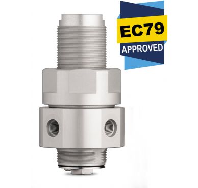 ■ EC79 Approved Pressure Regulator for Hydrogen Fuel Cell Buses and Trucks: Gas / Piston / Non-Venting / Max. Inlet: 438 bar (6,350 psi) / Max. Outlet: 20 bar (290 psi) / Cv 0.25